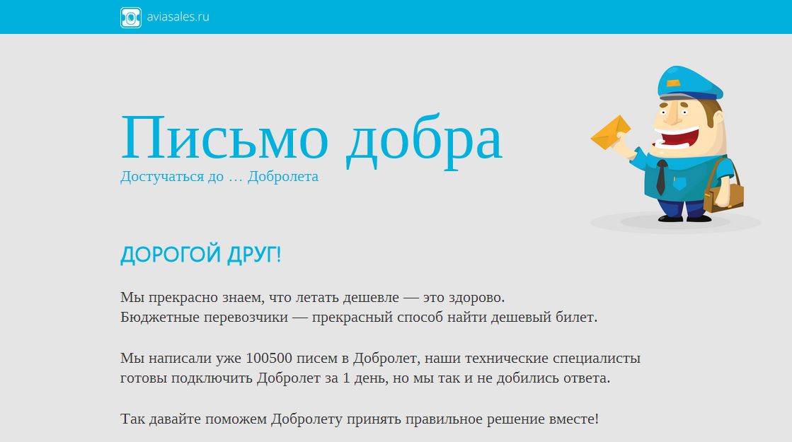 Отметим, что накануне метапоиск Aviasales запустил промо-кампанию «Письмо добра». Пользователям предложили отправить письмо «Добролету», чтобы бюджетный перевозчик подключился к сервису.