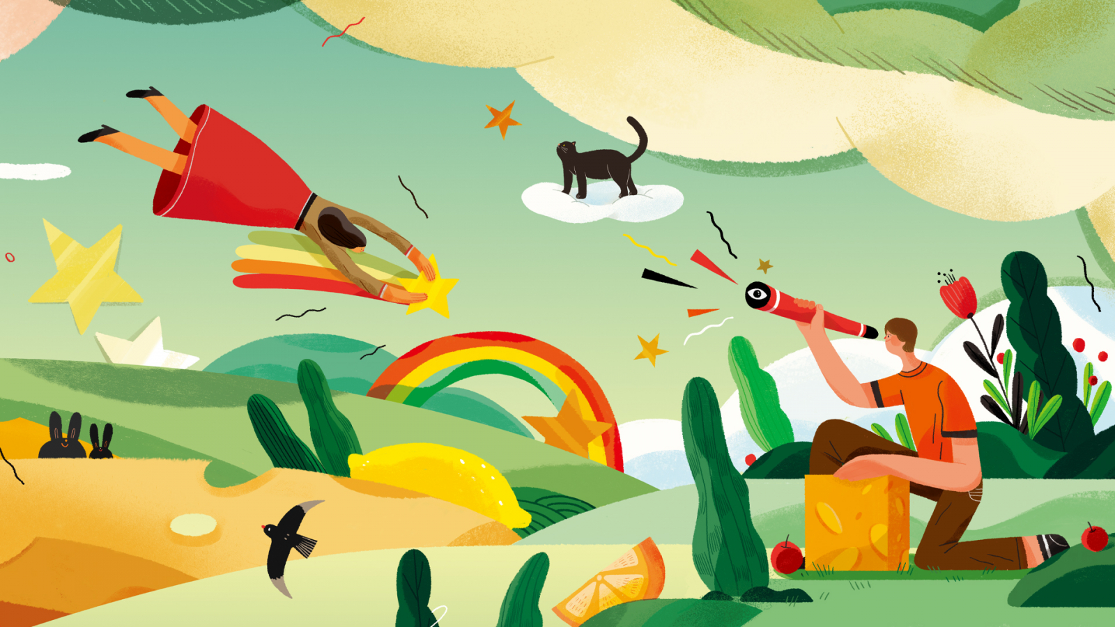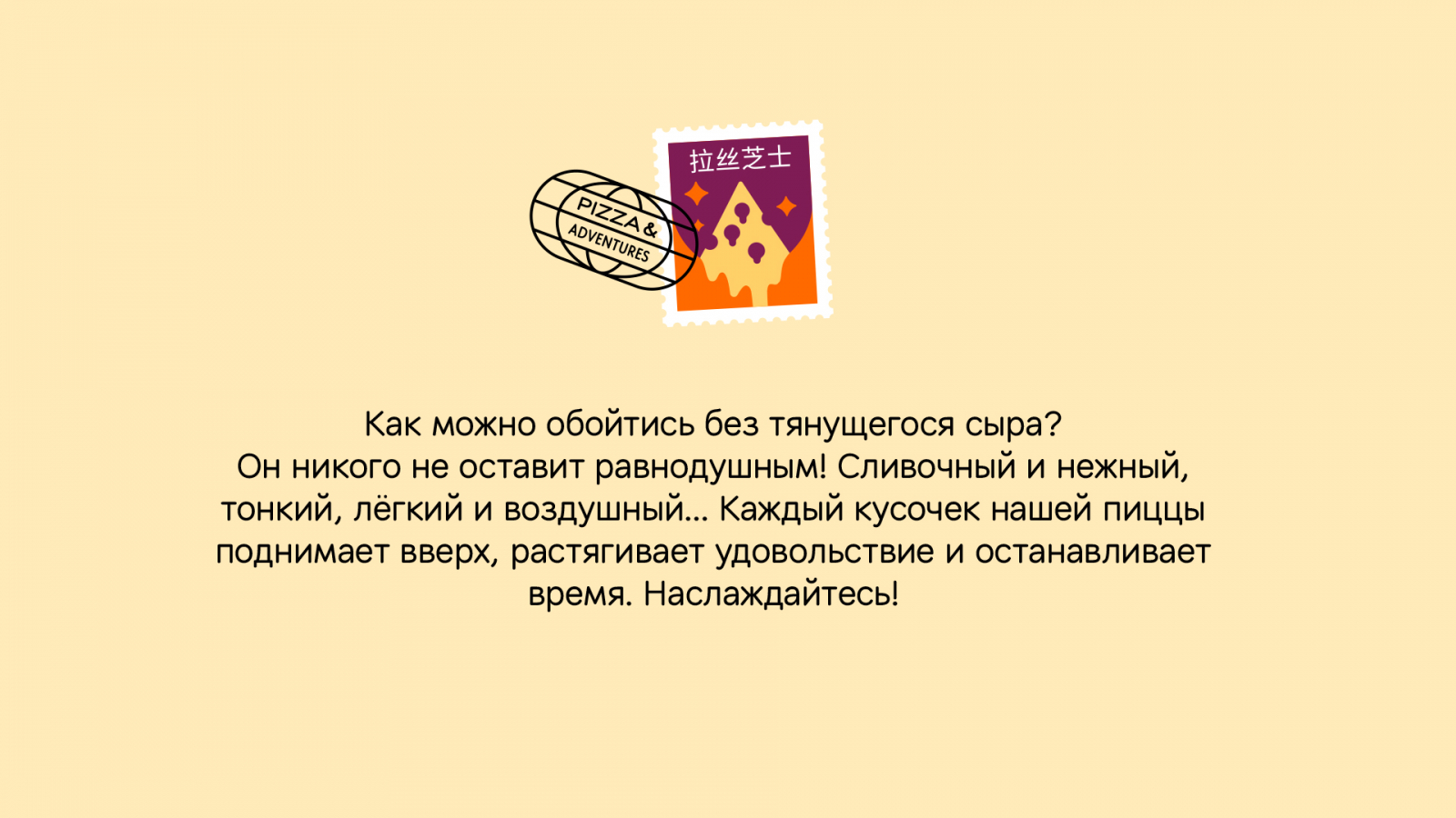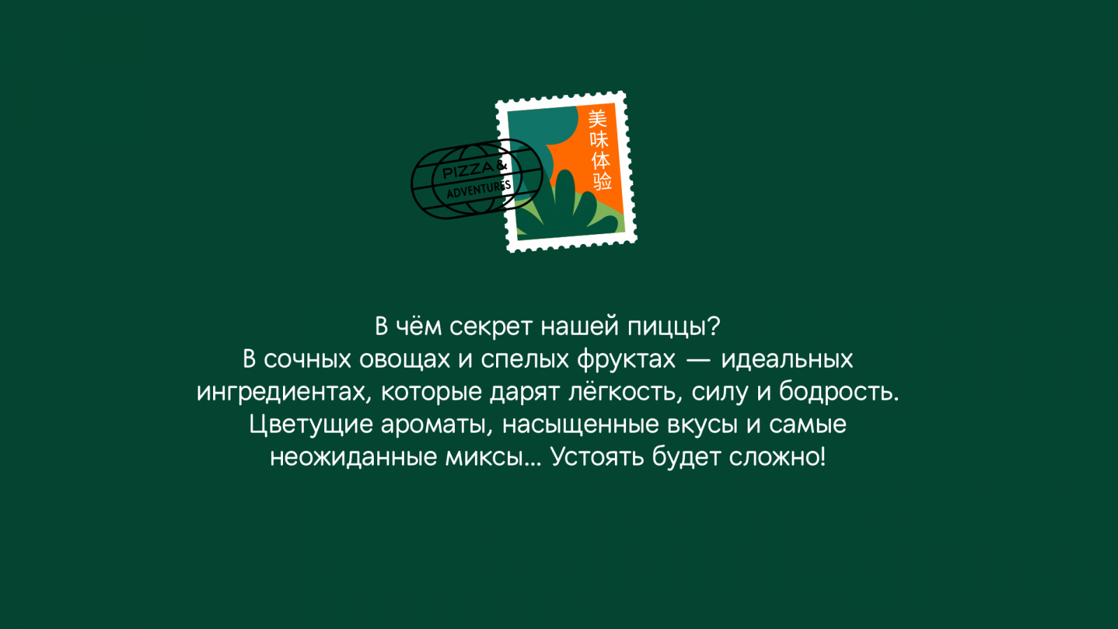 Нарисованные миры соответствуют продуктовым преимуществам бренда. Каждая иллюстрация — мир ощущений, который открывается с каждым кусочком пиццы. Только эмоции и чувства — всё то, что мы готовы получить, попробовав пиццу. Эту идею выражает слоган — Pizza & adventure.