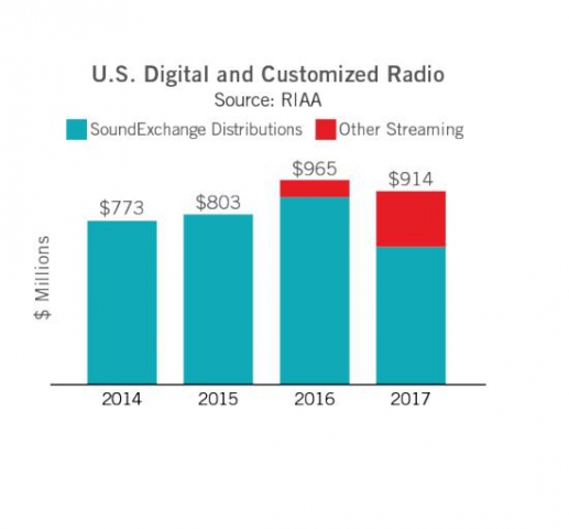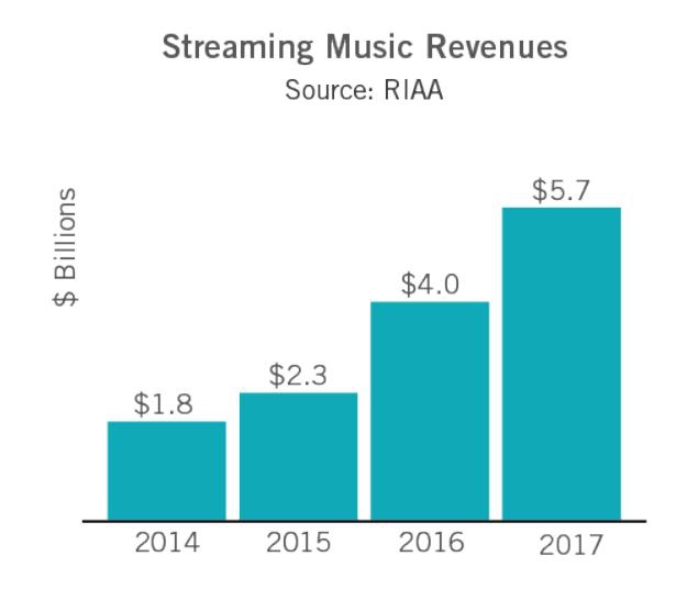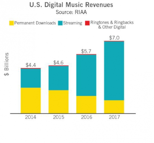 При этом обе категории показывают ежегодное падение продаж в то время, как увеличивается доход сервисов потокового аудио, таких как Spotify и Apple Music. За 2017 год такие сервисы заработали более $ 5,7 млрд — на 43% больше, чем в прошлом году. Эта сумма составила 65% от всех доходов.