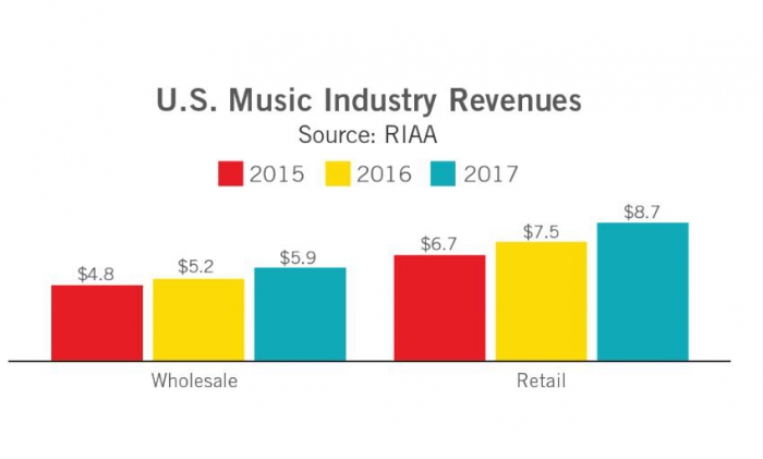 Продажи музыки на физических носителях превысили доходы от платного скачивания впервые с 2011 года. Общий объем рынка продаж музыки за год увеличился на 16,5% и достиг рекордных 8,7 млрд долларов. Для сравнения, по итогам 2016 года этот показатель составлял 7,7 млрд долларов, а в 2015 году — 7 млрд долларов.