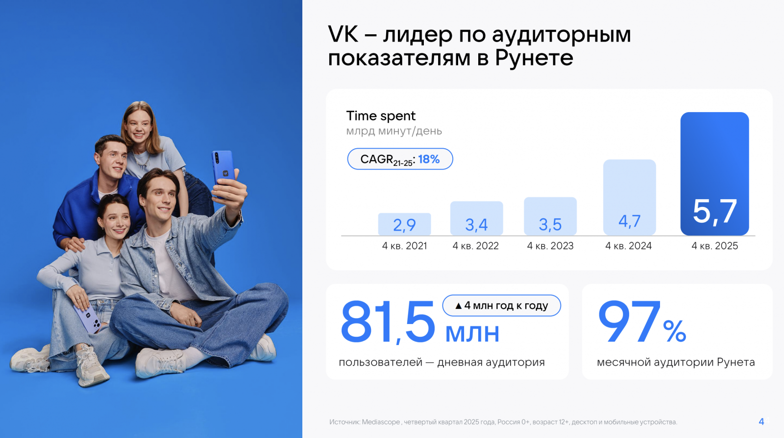 Средняя дневная аудитория сервисов VK достигла 81,5 млн пользователей, показатель time spent увеличился до 5,7 млрд минут в день, что на 20% выше аналогичного периода 2024 года. Средняя месячная аудитория «ВКонтакте» в России по итогам четвертого квартала составила 93,4 млн пользователей, средняя дневная аудитория — 62 млн пользователей.