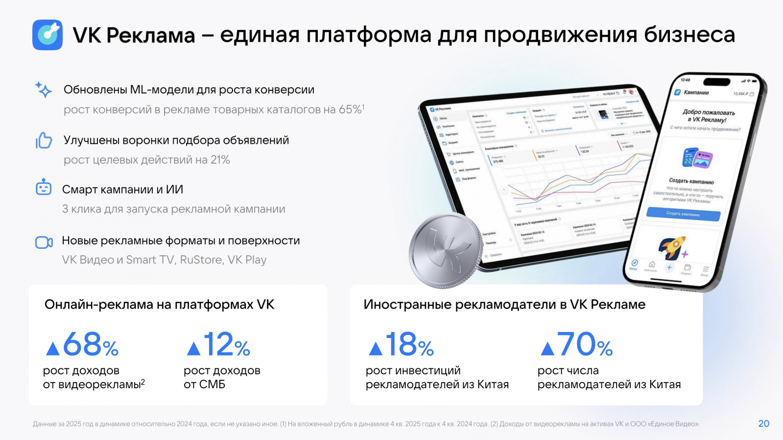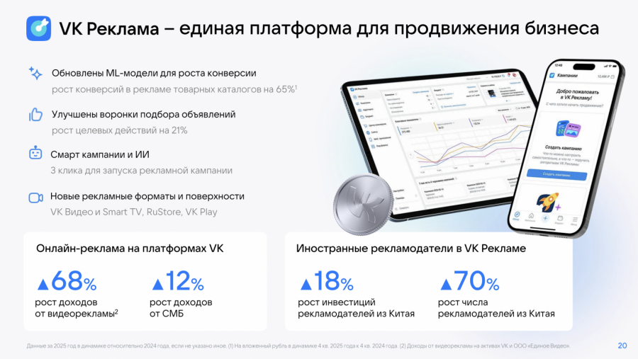 Количество рекламных кампаний в «VK Рекламе» в 2025 году выросло на 41%, число целевых действий — на 21% год к году. Объем рекламных каталогов увеличился в четыре раза. Зарубежные рекламодатели нарастили инвестиции в продвижение. В частности, компании из Китая вложили более 2,6 млрд руб., что на 18% выше уровня 2024 года.