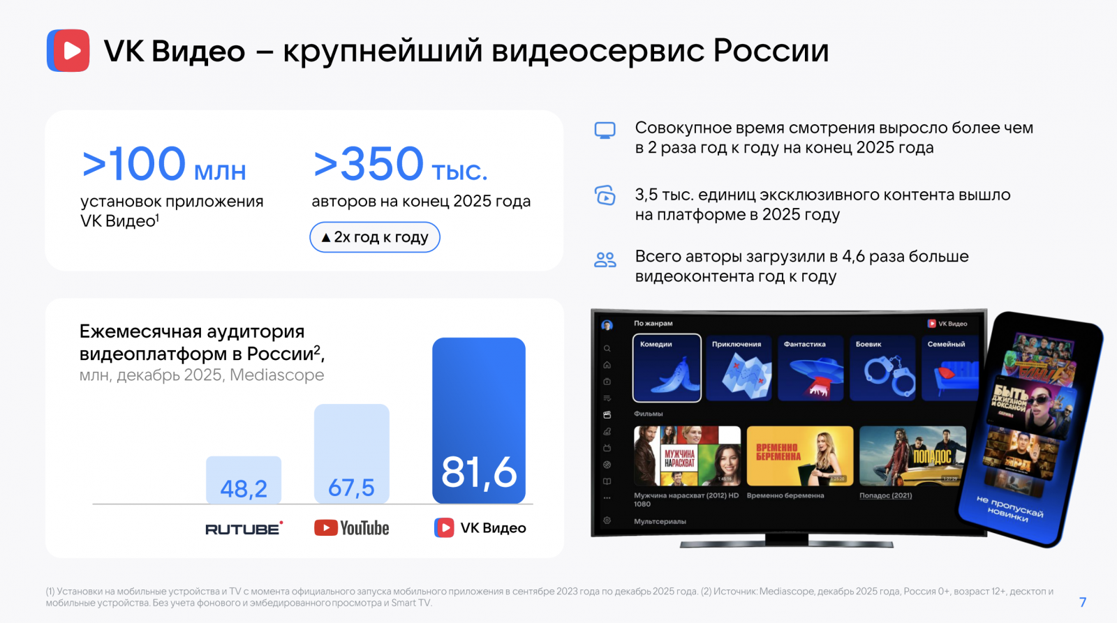 По данным Mediascope, в январе видеосервис «VK Видео» занял первое место среди видеохостингов в России по охвату аудитории за январь 2026 года.