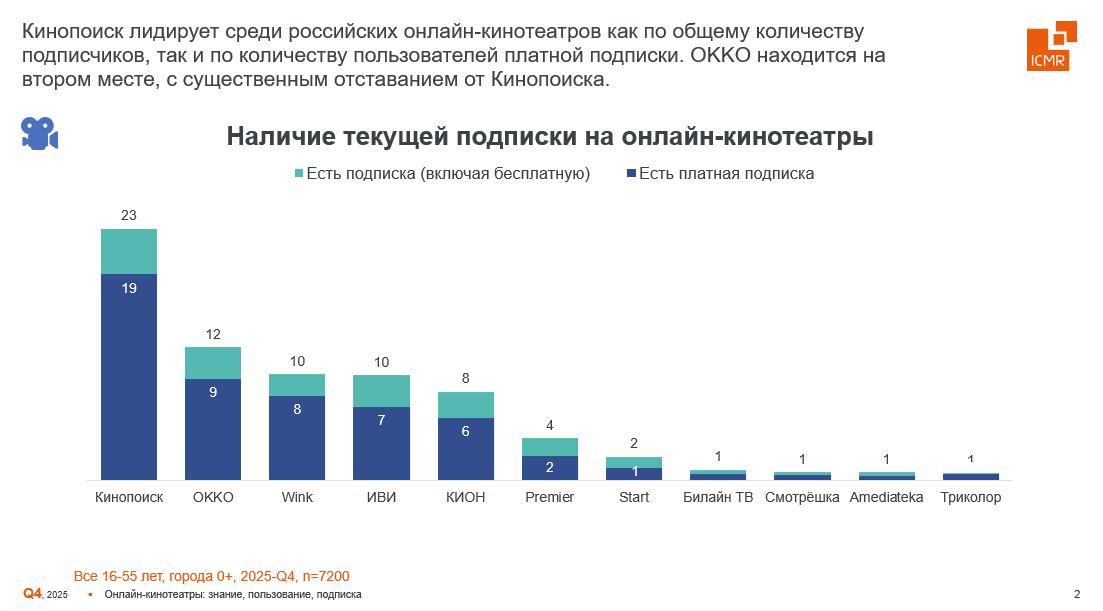 «Кинопоиск» по-прежнему занимает первое место среди онлайн-кинотеатров как по общему числу подписчиков (23% горожан ответили, что пользуются подпиской на этот сервис), так и по количеству пользователей платной подписки (19% в четвертом квартале 2025 года).