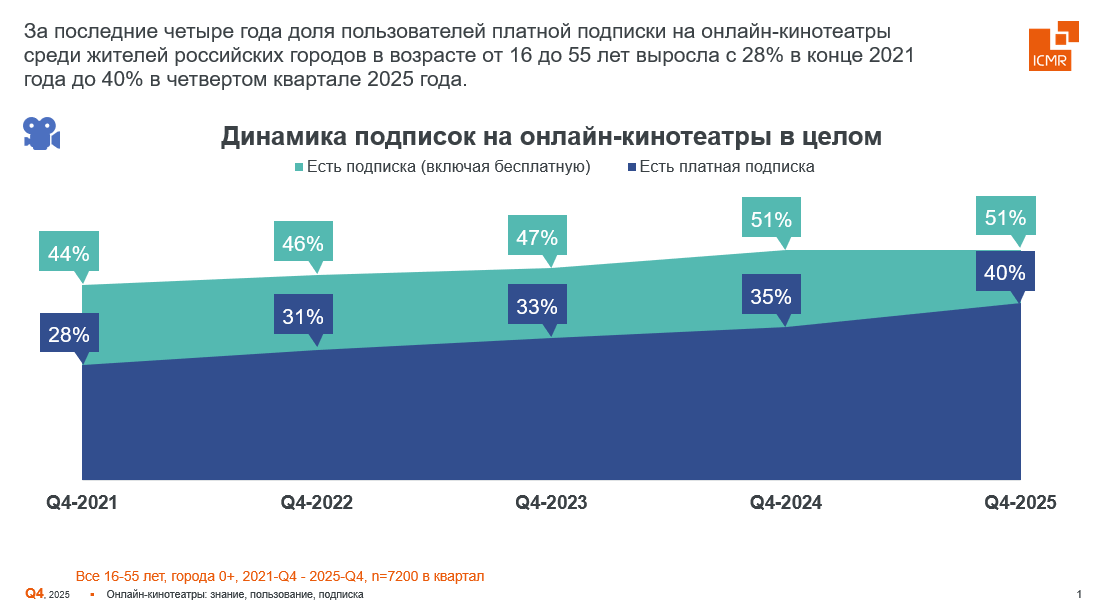 Согласно данным за четвертый квартал 2025 года, охват сервисов онлайн-кинотеатров среди городских жителей составил 51%, при этом доля платных подписок зафиксирована на уровне 40%. Показатели проникновения услуги остались стабильными и соответствуют уровню предыдущего отчетного периода. Такие данные приводит исследовательская компания ICMR.