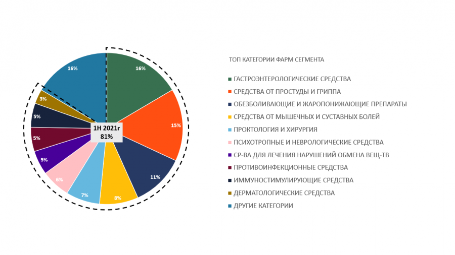 Несмотря на общее падение, топ наиболее инвестируемых категорий остается неизменным: гастроэнтерология (16%), противопростудные (15%), обезболивающие и жаропонижающие (11%), средства от боли в мышцах и суставах (8%), проктология и хирургия (7%), психотропные и неврологические препараты (6%), гормональные (5%), противовирусные (5%), иммуностимулирующие (5%), дерматологические (3%).