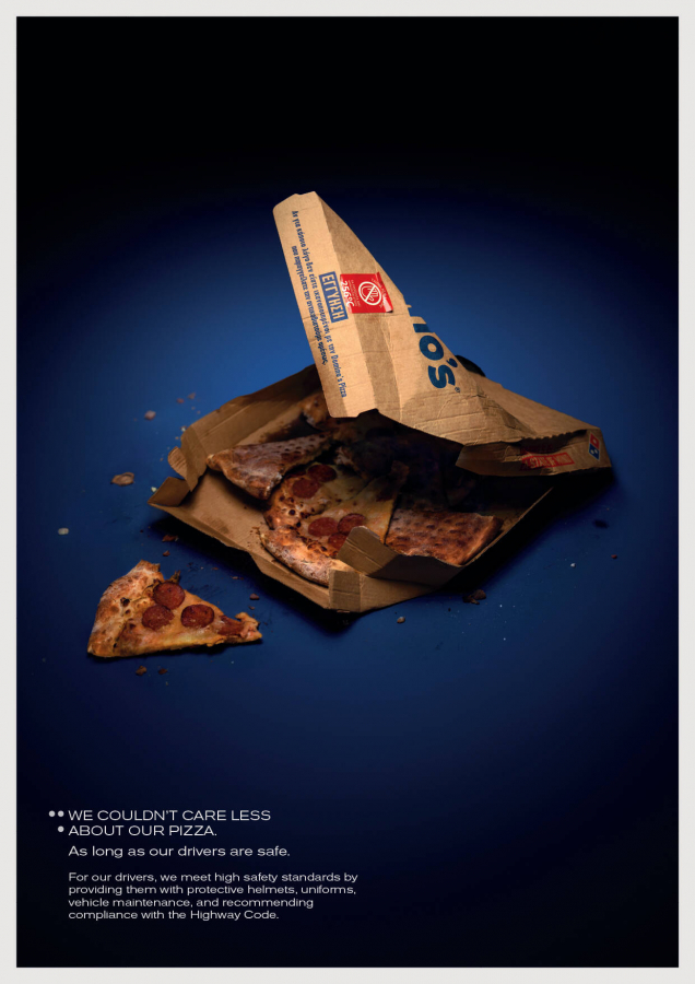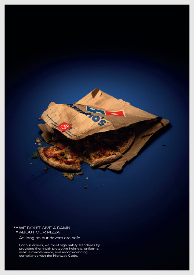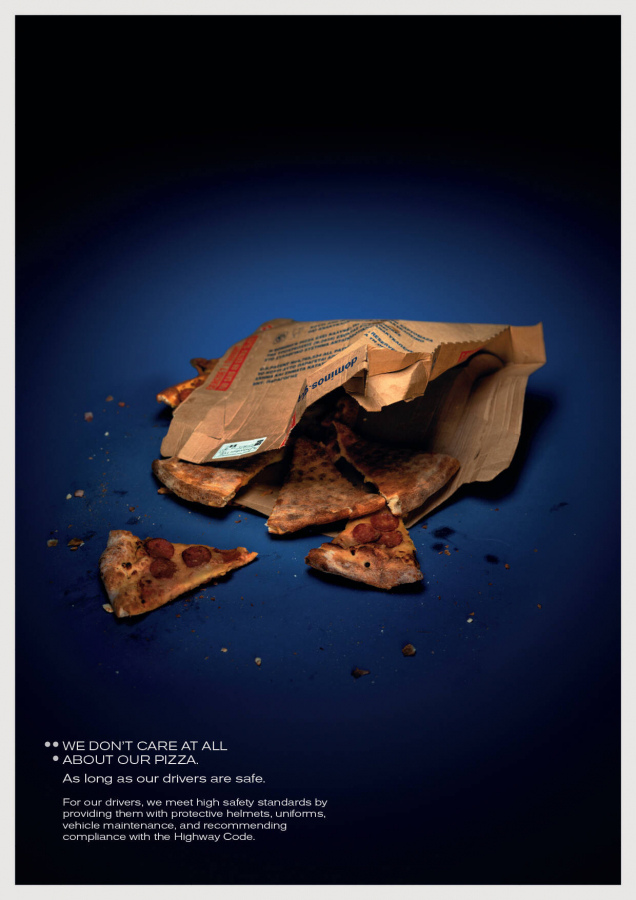 В рамках проекта Domino’s представила изображения поврежденных и помятых пицц, символизирующих аварии, в которые могут попасть курьеры на дороге. Главный посыл кампании: «Вы всегда можете приготовить другую пиццу. Но вы не можете заменить жизнь». Domino’s подчеркивает, что готова отказаться от скорости доставки в пользу безопасности сотрудников.