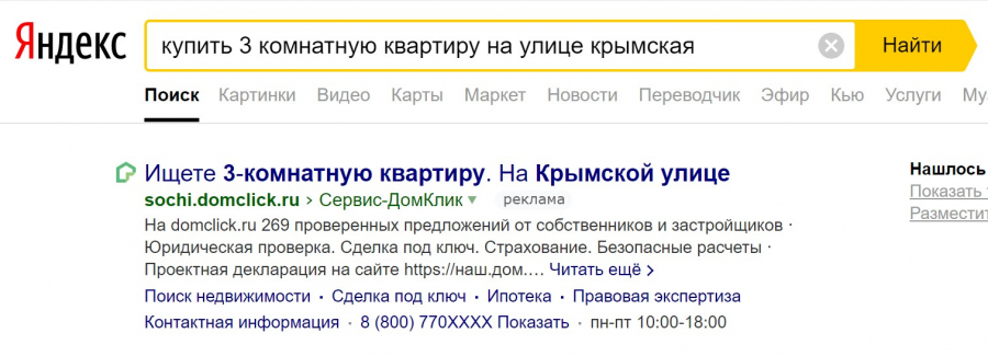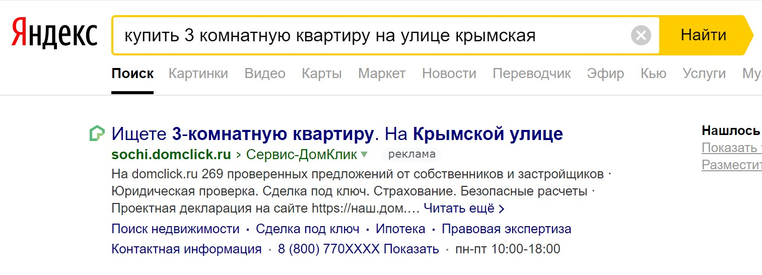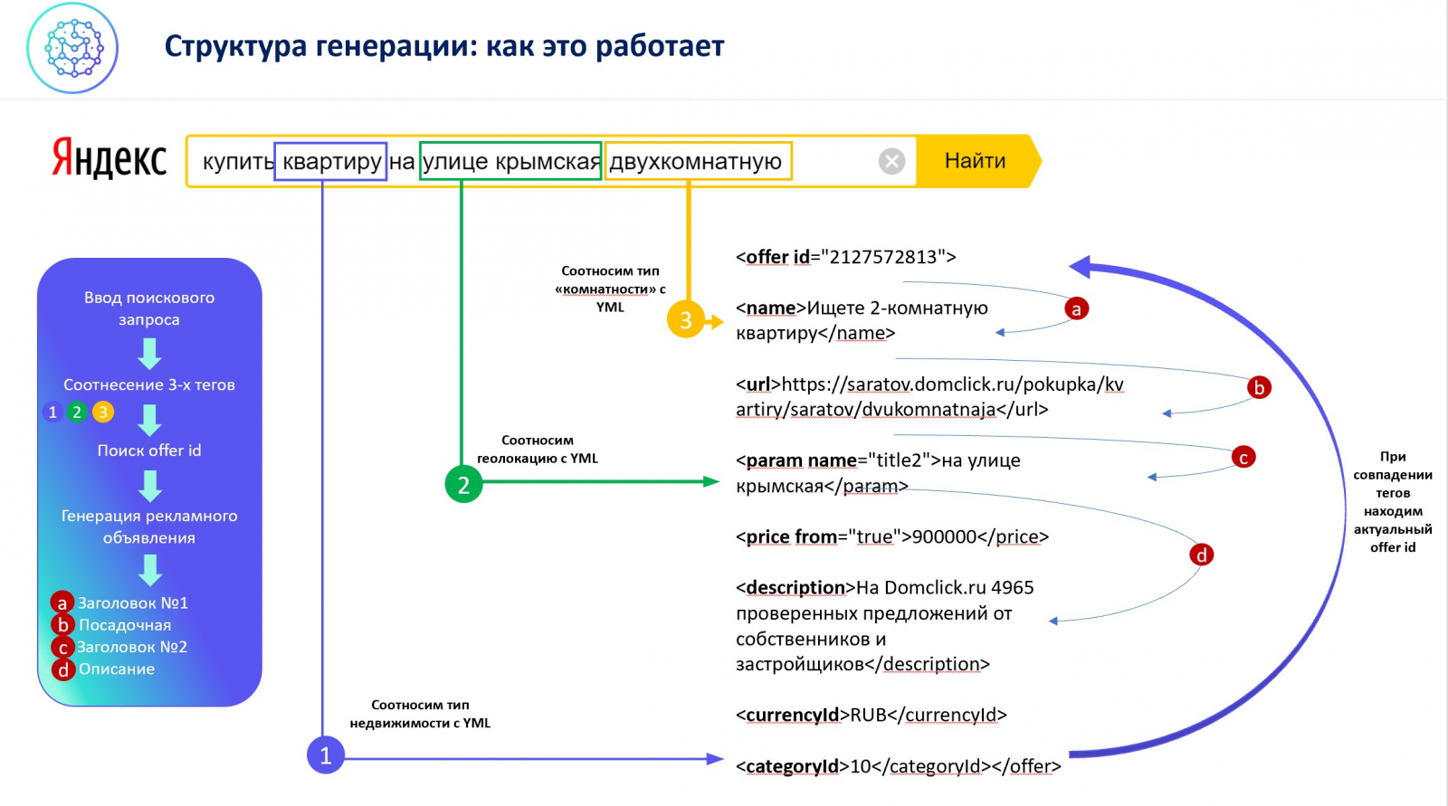 Скрипт находил в запросе слова из категории недвижимости — например, «квартира двухкомнатная», а также геолокации — «на улице Крымская». Затем он проверял, есть ли в фиде подходящий оффер, и если да, то генерировал объявление точно под запрос пользователя. Например, если пользователь вводил «купить 3 комнатную квартиру на улице Крымская», он видел объявление, которое максимально подходило под его запрос.