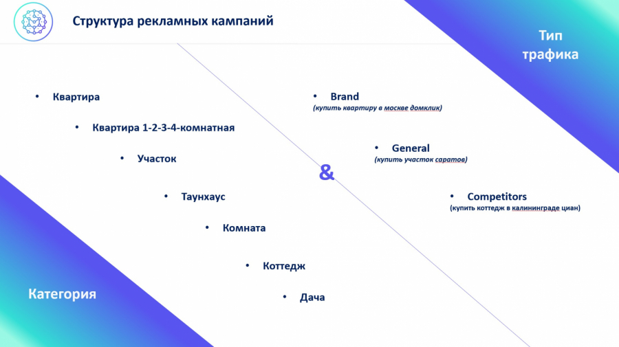 Мы с самого начала понимали, что подробная детализация приведет к созданию неповоротливого «монстра», которым будет очень сложно управлять. Поэтому кампании классифицировали так, чтобы привязать запросы к типу трафика (брендовый, конкурентный, общий) и разделам сайта «ДомКлика» по категориям недвижимости (дом, квартира, коттедж, дача