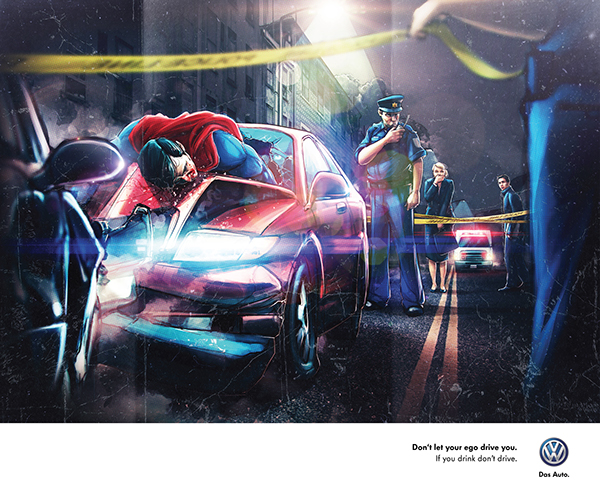 Арт-директор из Коста-Рики Фабио Обандо разработал серию впечатляющих принтов для автоконцерна Volkswagen. Цель кампании - напомнить водителям об опасности пьяного вождения. Не секрет, что алкоголь добавляет самоуверенности, что может завершиться крайне печально на дороге. Принты изображают супергероев, погибших во время ДТП. Слоган кампании: «Не позволяй своему эго управлять тобой».