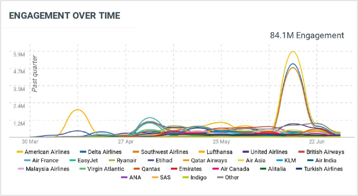 Пандемия в разгаре. Больше других страдают авиаперевозчики. Согласно отчету Talkwaker «Airline Industry Report Q2 2020» основные темы, в которых бренды авиакомпаний упоминались в социальных сетях — сокращение штата. 7,3 млн упоминаний о возврате или отмене и сокращении сотрудников. Наиболее негативный окрас из проанализированных сообщений получили Malaysia Airlines, AA и British Airways, а позитивный — Southwest, Qatar Airways и SAS.