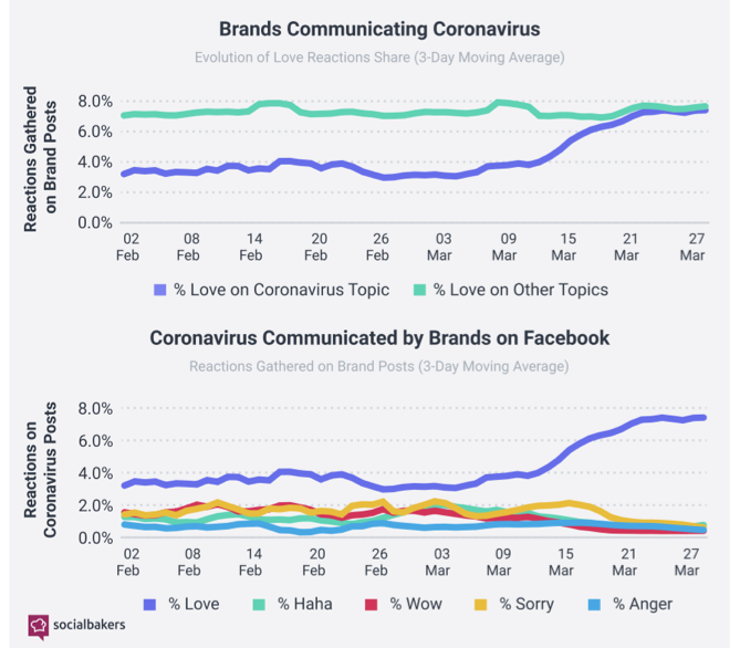 Согласно исследованию Socialbakers, бренды, которые публично включились в борьбу с COVID-19, получили большую поддержку от потребителей. Люди были благодарны за то, что те делают для местных коммьюнити, своих работников, медиков или вообще для борьбы с пандемией.