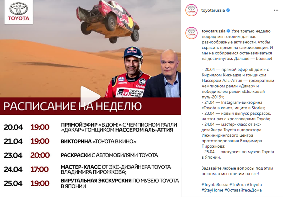 Бренд Toyota также запустил серию трансляций в Instagram с использованием разнообразных форматов взаимодействия — от лекций до викторин — с участием специалистов компании.