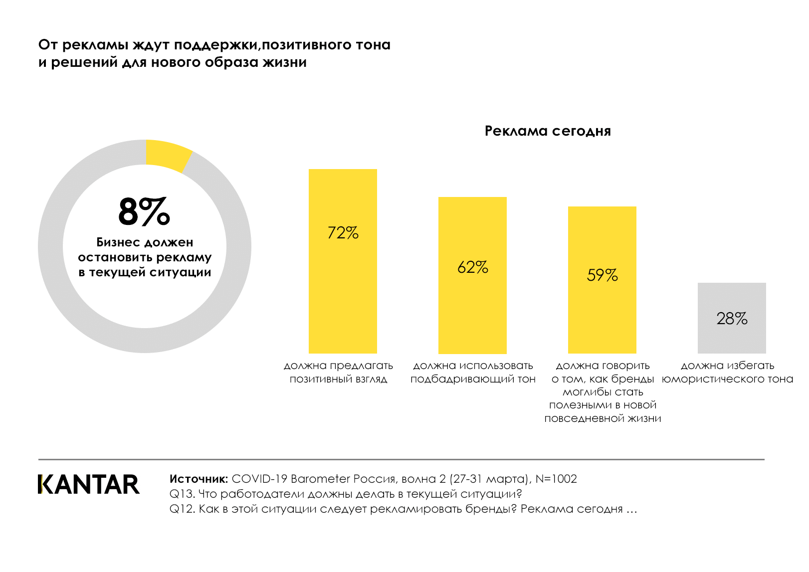 Менять всю коммуникацию под онлайн-продажи сейчас бессмысленно, поскольку отсутствие у пользователей такого паттерна поведения делает процесс его создания долгосрочным, а действовать можно и нужно уже сейчас. Согласно исследованиям Kantar, отношение к регулярной рекламе не изменилось, и пользователи положительно относятся к докризисной коммуникации.
