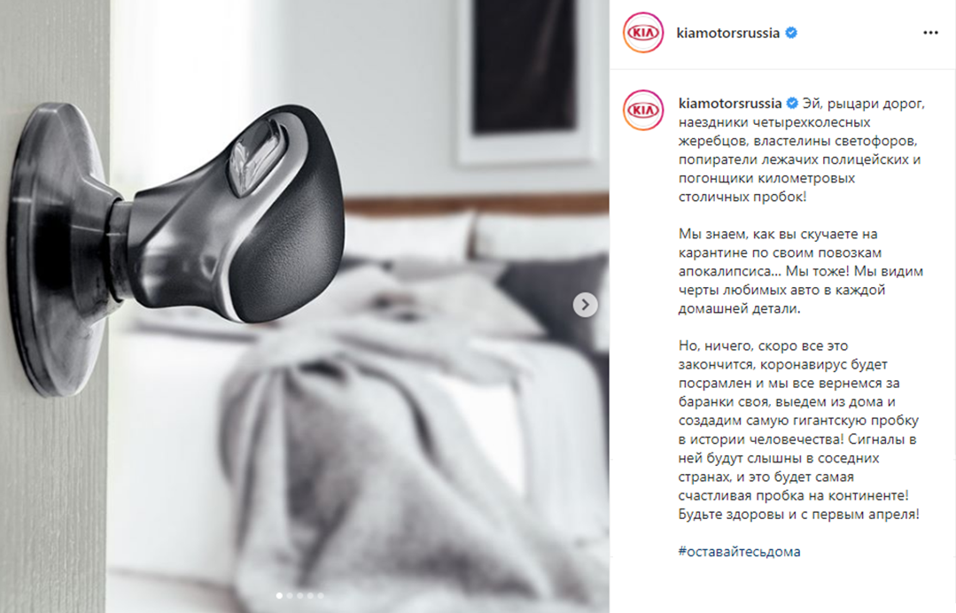 На данный момент автобрендами может быть использована более смелая механика активности. Поскольку из-за самоизоляции паттерны digital-поведения меняются сильнее, чем в прошлый кризис, контент соцсетей стал более «домашним» и креативным. Селфи стали смешными, а видео — изощренными. Социальное дистанцирование — это стресс, в условиях которого потребление чего-то нового происходит намного проще, что делает пользователей открытыми новым идеям и форматам взаимодействия. Для брендов это возможность пробовать в коммуникации что-то совершенно новое и быть смелее, чем обычно.