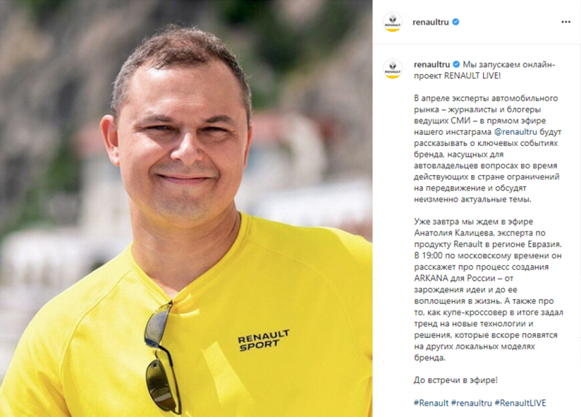 Прямые трансляции стали одним из самых распространенных форматов контента. Renault Россия запустила серию информационных трансляций RENAULT LIVE — прямые эфиры в Instagram с экспертами автомобильного рынка. В рамках проекта можно узнать о лайфхаках про автомобили, а также о том, как себя вести автомобилисту во время действующих ограничений на передвижение.