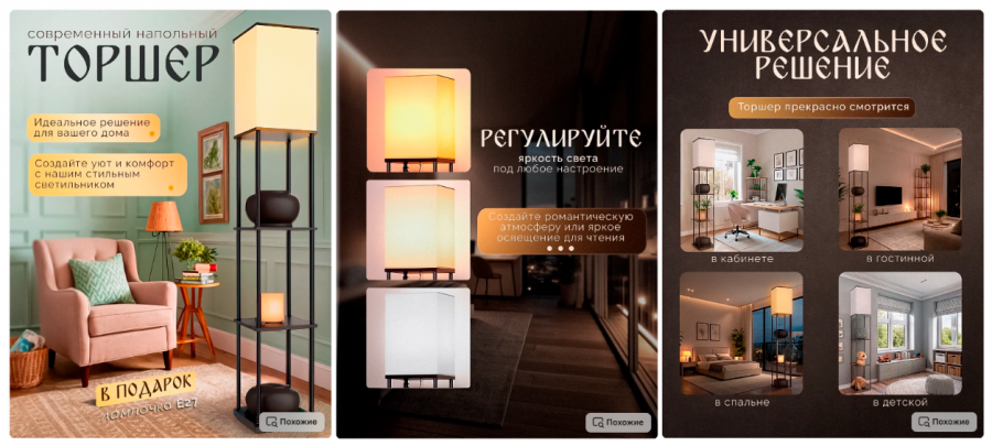 Кому подходит прием: всем, кто продает «визуальные» товары: предметы интерьера и декора, уходовые средства, украшения, аксессуары, подарки, стильные штучки. Ваша карточка должна быть как пост в Pinterest: не просто информативная, а красивая и вдохновляющая.