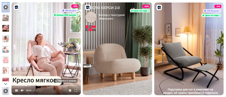 - Видео. Максимум 10−15 секунд, плавные переходы, без лишних слов и пауз, чтобы удержать внимание дримскроллера и вызвать желание узнать больше. Покажите товар в движении: фактуру ткани, как свет отражается, посадку на модели или работу механизма. Видео «оживляет» товар и отвечает на важные вопросы без лишних слов.