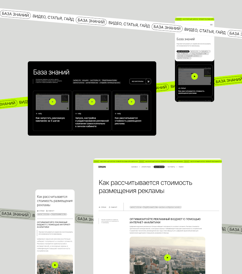Для всех сегментов аудитории был актуален один барьер: «Dron — достаточно сложный сервис». Одним из ответов стал пересмотр блога и раздела с кейсами на сайте. Мы превратили их в полноценную базу знаний с материалами под разные запросы и удобной навигацией.