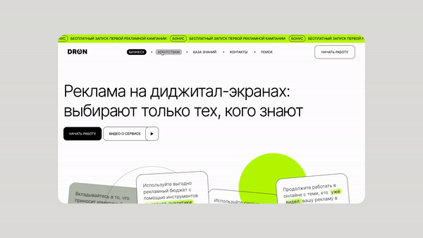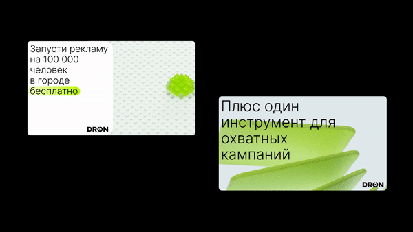 Команда Dron хочет перевернуть подход к наружке и сделать её доступной каждому. Отсюда родилась миссия — сделать наружную рекламу измеримой и доступной даже для микробизнеса. Дух команды, миссия и функциональные преимущества компании легли в основу нового позиционирования: «Dron — простой и удобный сервис для самостоятельного запуска рекламы на видеоэкранах в городе».