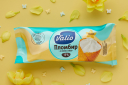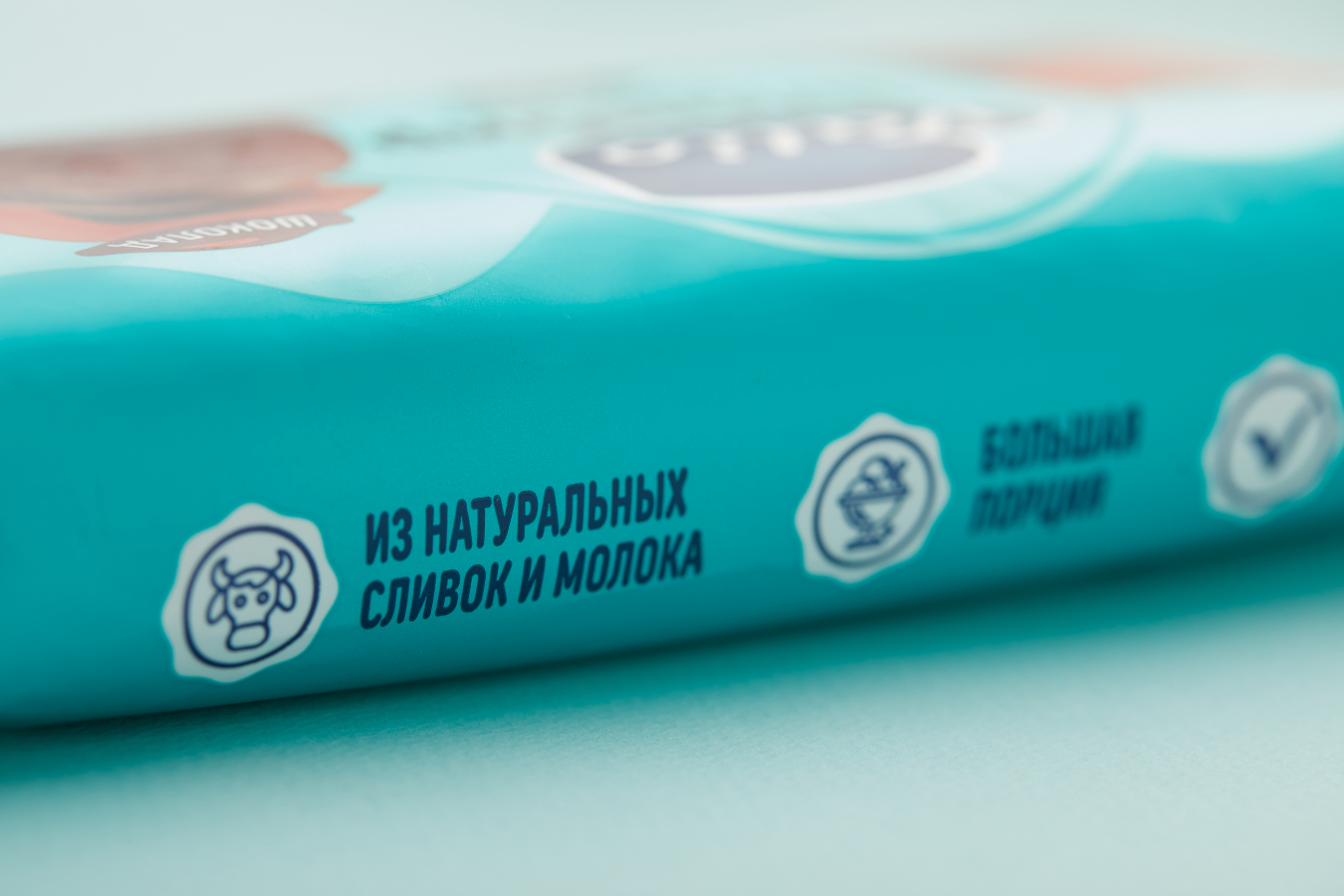 Таким образом, наши дизайнеры с помощью клеймов в центре упаковки обозначили повышенную жирность продукта — 15%, а также его состав — «из натуральных сливок».