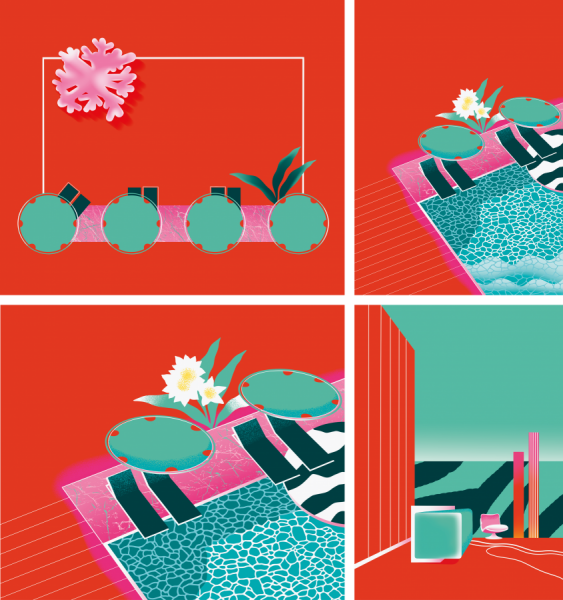- Графическая система. Минималистичные иллюстрации ключевых пространств и паттерн сформировали гибкую систему для разных носителей — от полиграфии до выставочных стендов.