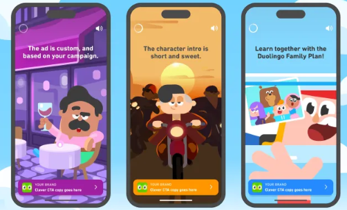 В основе платформы — фирменный юмор и персонажи Duolingo, которые появляются в коротких видео и нативных рекламных материалах. Ролики встроены в процесс обучения, но не прерывают уроки.