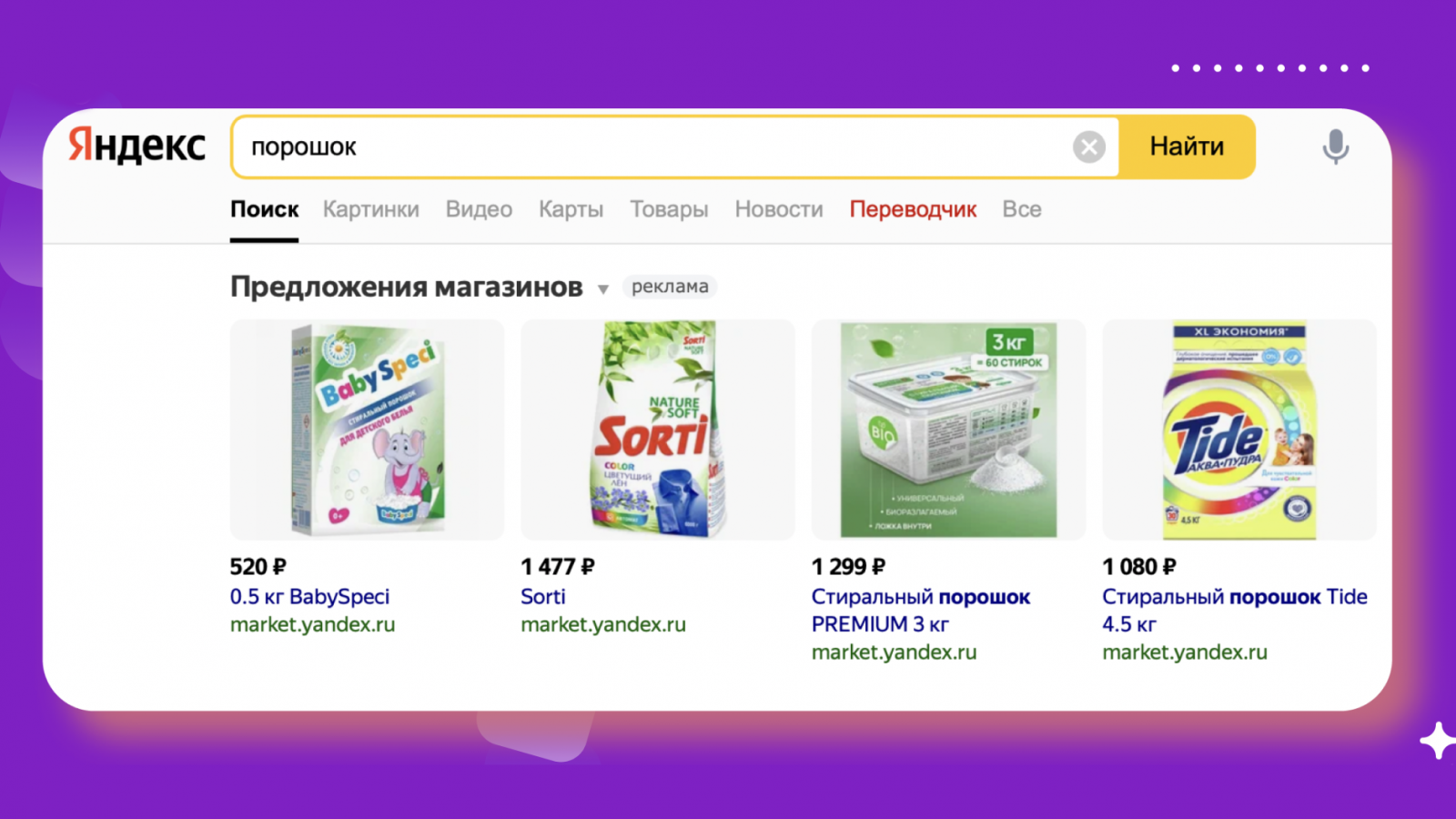 Можно рассмотреть работу контекстной рекламы на примере «Яндекс.Маркета». Его рекламный кабинет интегрирован с «Директом» — это очень удобно. Пользователи увидят карточку товара, если будут искать товары из этой категории в «Яндексе». Например, вы хотите купить стиральный порошок, вводите поисковый запрос «Порошок», первыми будут показаны рекламные объявления товаров, которые продаются в «Яндекс.Маркете».
