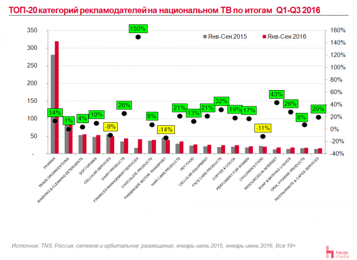 В третьем квартале все рекламные категории продолжают показывать рост спроса на телевизионный инвентарь. Рынок телевизионной рекламы захватили отрасли фармацевтики и финансов. Более 80% всего телевизионного рекламного рынка приходятся на двадцатку лидеров рекламодателей национального ТВ.