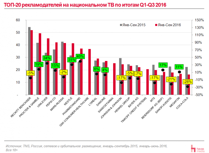 С точки зрения топовых рекламодателей, ситуация с учетом третьего квартала принципиально не изменилась. Reckitt Benckiser стабильно удерживает первое место, даже с учетом снижения его показателей на 5 %.