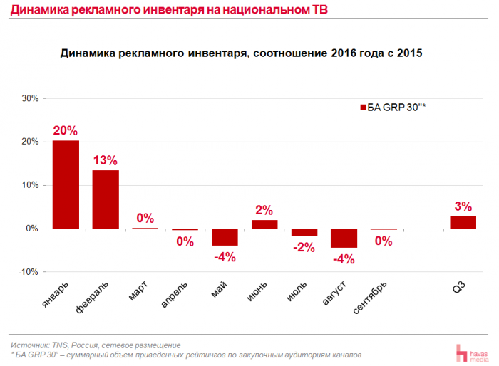 В остальных месяцах, начиная с марта, достаточно стабилен рекламный инвентарь и колеблется в пределах изменения телесмотрения. Как в марте, так и в апреле мы видим 0%. Амплитуда между маем и сентябрем составляет максимум 4%, в отличие от начала года, где изменения значительны, почти в два раза — разница между январем и февралем составила 7%.