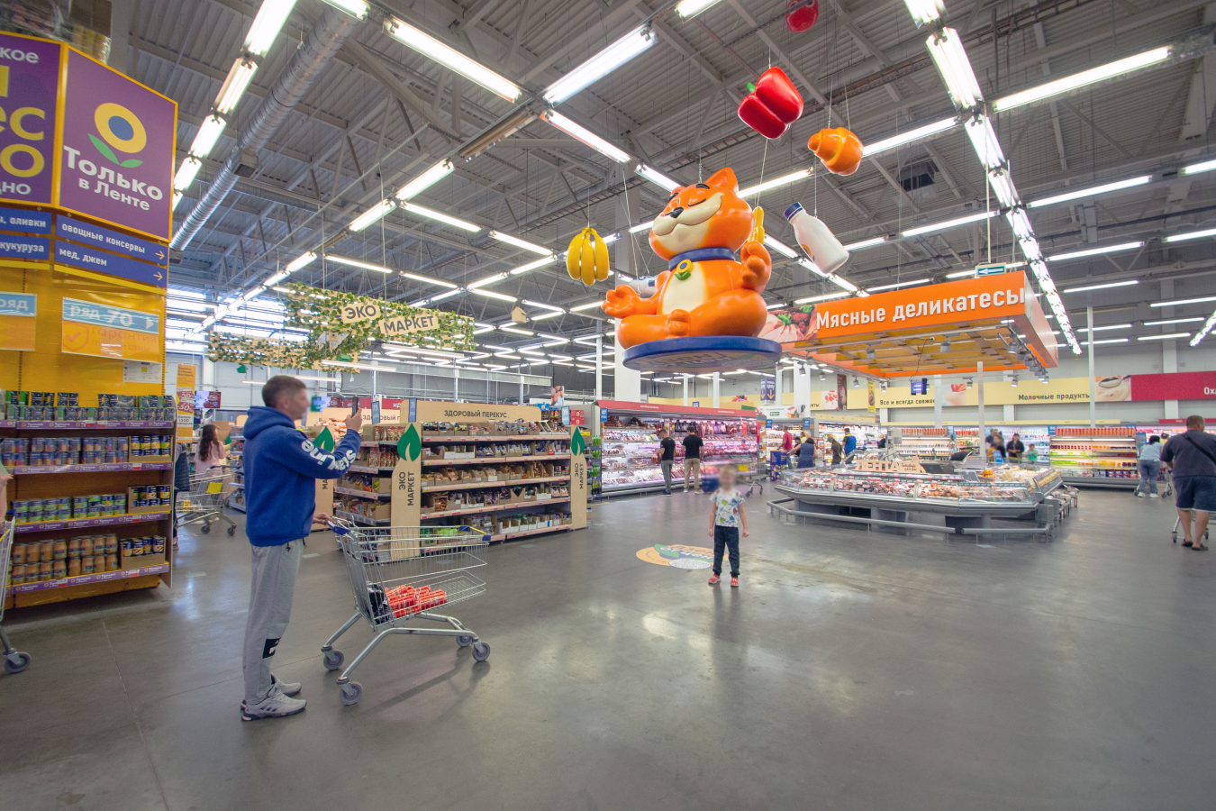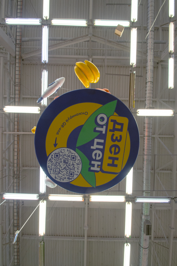 Особое внимание привлекает арт-объект — 2,5-метровый Кот Ух, символ «Дзена от Цен». Он «левитирует» в гипермаркете «Ленты» в Новосибирске, а рядом размещен QR-код с переходом в онлайн-каталог с актуальными предложениями.
