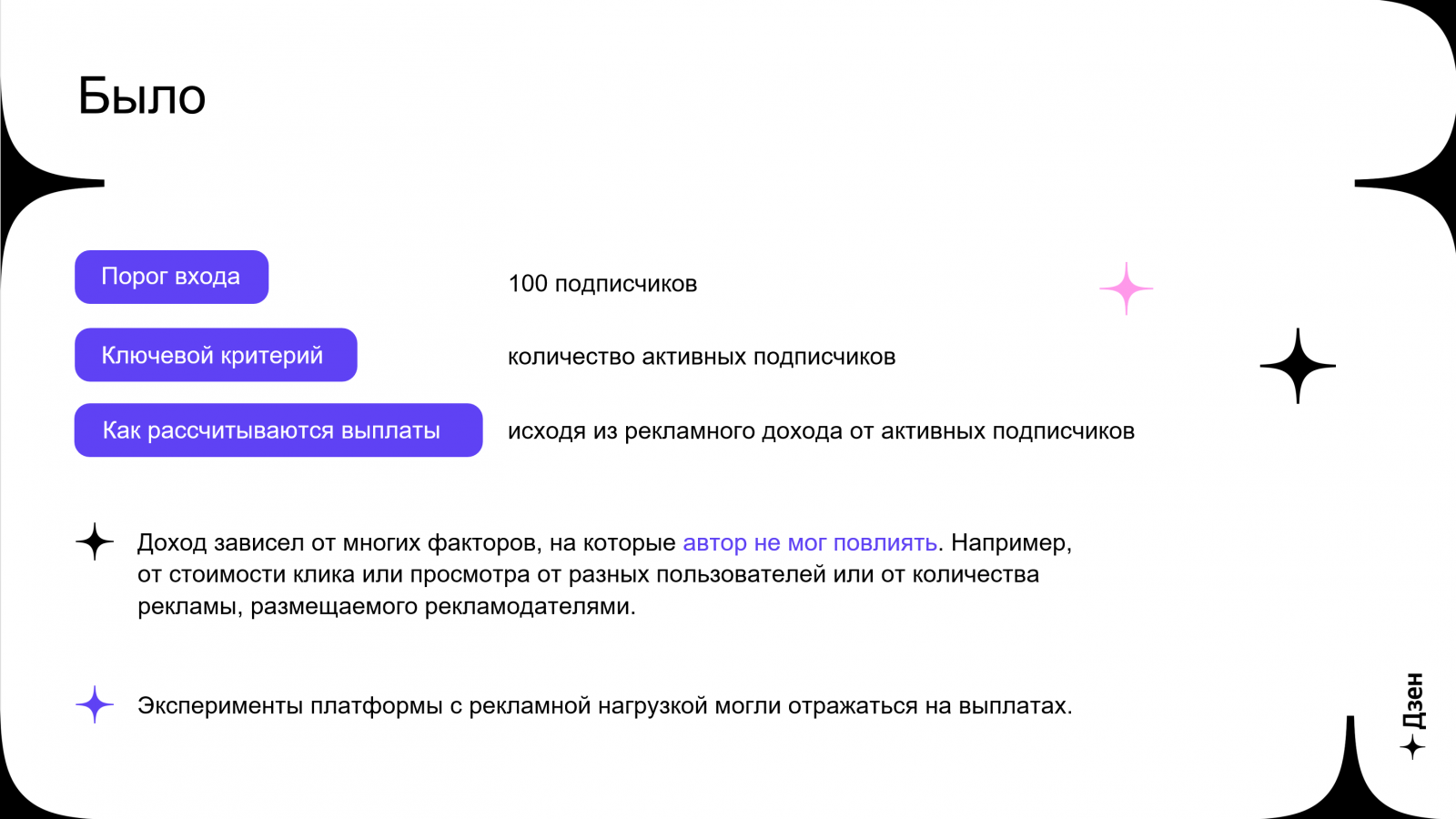 В компании напомнили, что с весны 2022 года «Дзен» платил за активных подписчиков. Рекламный доход распределялся в зависимости от того, сколько пользователей подписались на канал автора и как регулярно взаимодействовали с его контентом. Вознаграждение за активного подписчика могло отличаться, поскольку пользователи видели разное количество рекламы и разные по стоимости сообщения. Для авторов эти факторы были непрозрачны, и они не могли на них влиять.