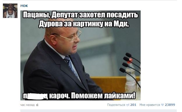 Депутат Госдумы Михаил Маркелов потребовал привлечь главу «ВКонтакте» Павла Дурова к уголовной ответственности. Единоросса возмутила публикация в крупнейшем сообществе соцсети MDK. Картинка с нецезурной подписью и просьбой «Поможем лайками» была посвящена теракту в Волгограде.