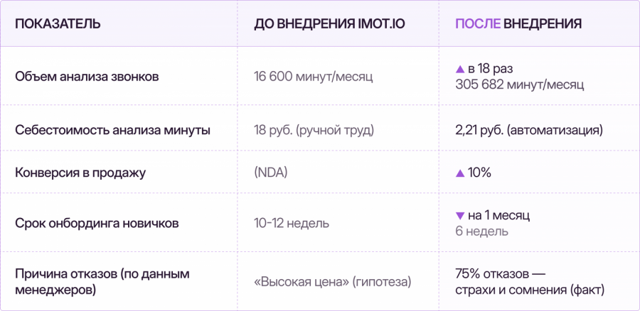 Система начала переводить в текст и анализировать 100% звонков. Объем анализируемых данных вырос в 18 раз: с 16 600 до 305 682 мин. в месяц. При этом себестоимость анализа одной минуты разговора упала с 18 руб. (при ручном труде) до 2,21 руб.