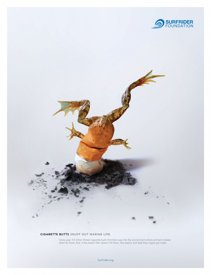 В частности, Surfrider Foundation подняла проблему загрязнения морской флоры и фауны. Для того, чтобы наглядно показать опасность, которую несут выброшенные в воду окурки, креативщики превратили в них птицу, рыбу и лягушку.