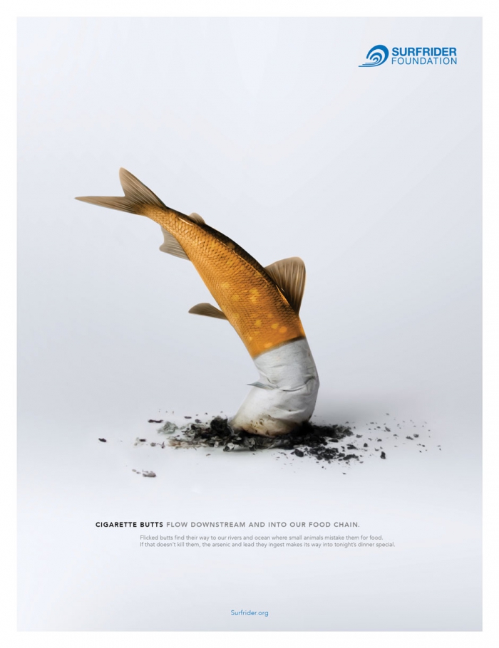 Экологическая организация Surfrider Foundation совместно с креативщиками агентства Gyro San Francisco разработали серию принтов, наглядно показывающих негативное влияние мусора, а именно сигаретных окурков, на окружающую среду.