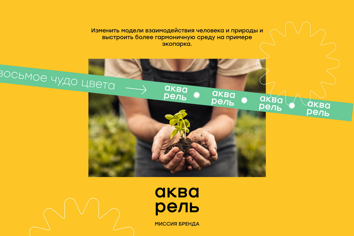 Слоган бренда — «Восьмое чудо цвета». В главном сообщении есть прямая связь с названием «Акварель», а также отсылка к уникальным объектам, созданным человечеством, — «семи чудесам света». Фраза транслирует ценности экопарка, демонстрирует смелость и амбициозность бренда.