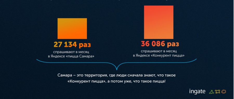 Сеть пиццерий с присутствием в 40 городах России поставила перед нами задачу вдвое увеличить продажи с сайта в Самаре. Проблема заключалась в том, что в этом регионе запросы вида «пицца Самара» в Яндексе имели меньший спрос, чем «пицца + бренд конкурента». То есть жители сначала спрашивают пиццу известного им бренда, и лишь потом ищут пиццу в принципе. Это означало, что получить нужное количество заказов только с помощью SEO и контекстной рекламы в рамках выделенного бюджета просто невозможно.