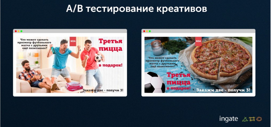 Так, в дни проведения футбольных матчей для фанатов показывали рекламу, ориентированную на болельщиков. Это таргетированные посты и баннеры в соцсетях, аудиторные RTB-закупки. При этом мы проводили постоянное A/B-тестирование креативов, чтобы выбрать самые эффективные.