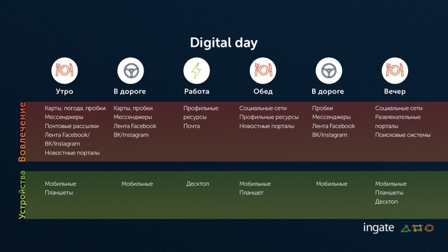 Мы «нарезали» аудиторию на сегменты по поведению и потребностям, изучили их вплоть до того, как они себя ведут в течение дня: какими устройствами пользуются для выхода в интернет, в каких соцсетях сидят, какие сайты посещают.