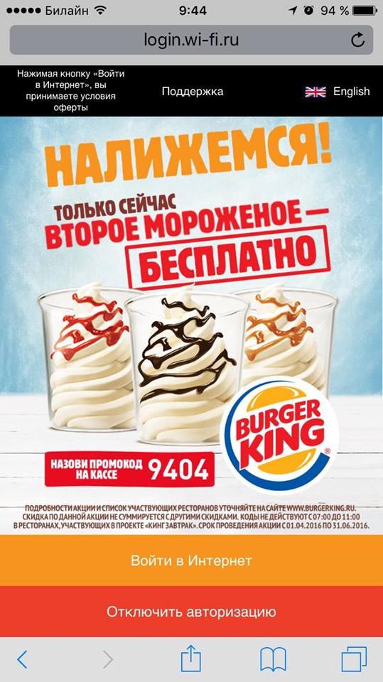 Рекламные объявления сети Burger King со слоганами «Смотри не обострись!» и «Налижемся!» демонстрировались при подключении к бесплатному Wi-Fi в московском метро. Кампания со слоганом «Смотри не обострись!» стала скандально известной, так вызвала жаркие дискуссии среди интернет-пользователей и спровоцировала проверку ФАС.