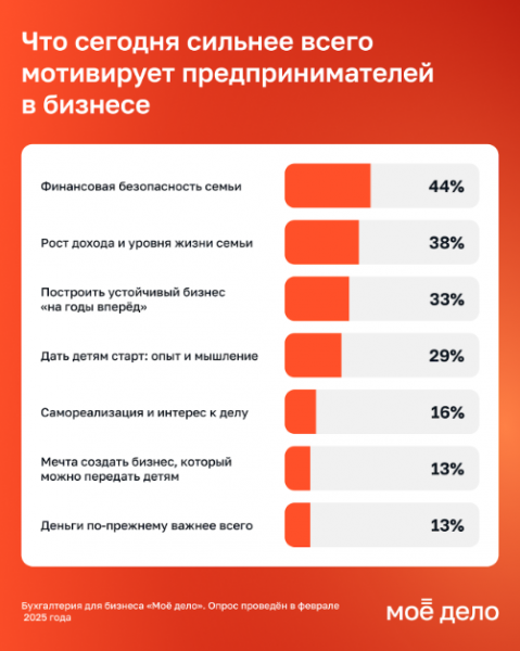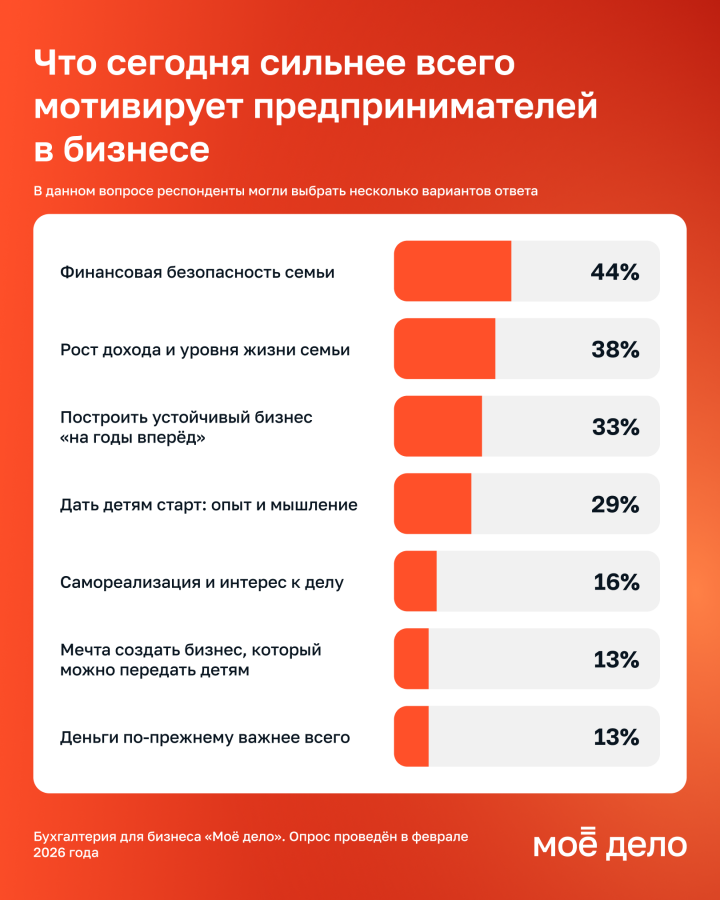 Для 44% респондентов главным ориентиром в бизнесе является финансовая безопасность семьи. А 38% стремятся к росту дохода и уровня жизни, 33% ориентированы на построение устойчивого бизнеса «на годы вперед».