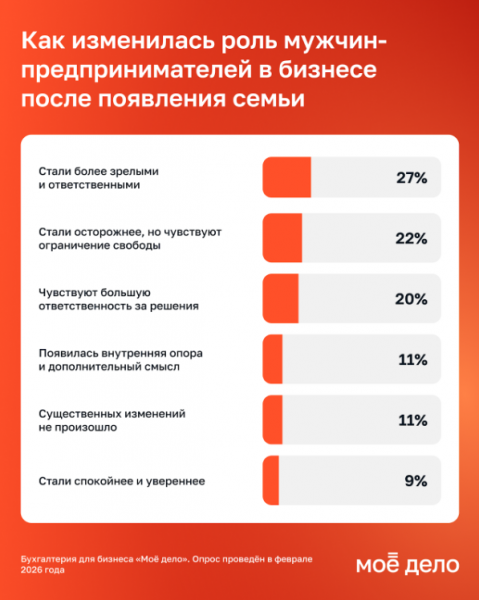 Предпринимательство часто ассоциируется с риском, амбициями и стремлением к быстрому росту, однако с появлением семьи и детей фокус, по словам опрошенных, смещается — об этом говорят сами предприниматели. По данным исследования бухгалтерии для бизнеса «Мое дело», 49% опрошенных мужчин-предпринимателей отметили, что после появления семьи стали чаще принимать взвешенные решения, ориентироваться на стабильность и соотносить планы роста с финансовыми возможностями компании. Еще 44% называют финансовую безопасность семьи главным ориентиром в бизнесе.