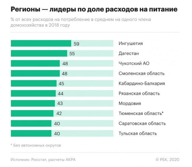 Лидерами списка стали Ингушетия (59%), Дагестан (55%), Чукотский автономный округ (48%), Смоленская область (48%) и Кабардино-Балкария (45%). Это доля на питание от всех расходов в расчете на одного члена домохозяйства.