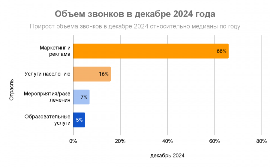 На фоне перехода к письменным форматам коммуникаций, для ряда ниш голосовой канал общения остается важным. В декабре он показывает рост относительно средних показателей по году. Объем звонков в сегменте маркетинга и рекламы в декабре 2024 года вырос на 66% относительно медианного значения по году и на 83,9% относительно декабря 2023 года. В сфере развлечений в декабре 2024 года показатель увеличился относительно декабря 2023 года на 55,9% и на 7% к годовой медиане.