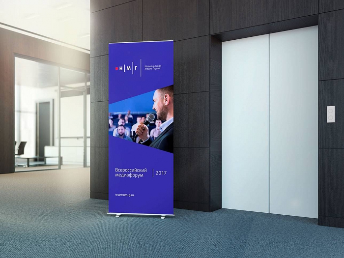 Семантика знака построена на объединении двух идей - расходящихся в пространстве медиаволн, источником которых является красная точка в левой части логотипа, что считывается в контурах знака. Последовательное увеличение вертикальных штрихов говорит о расширении медиаохвата, росте активов, энергии и динамичном характере бренда, а «точка–импульс» коммуницирует идею компании-трендсетера, формирующего вектор развития медиабизнеса. Цветовая палитра бренда, близкая к цветам национального триколора, а также специально разработанная система дополнительных стилеобразующих элементов развивают графическую идею знака и помогают донести идеологию бренда НМГ.