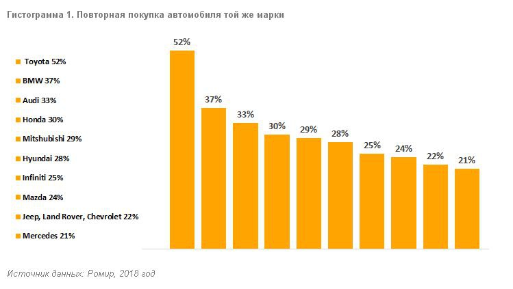 Чаще всего россияне делают повторный выбор в пользу Toyota (53% автовладельцев). При этом 40% возвращаются за ними в тот же дилерский центр, в котором делали предыдущую покупку. Немецкая BMW оказалась на втором месте. Результат этой компании — 37%. Поклонники немецкого автопроизводителя демонстрируют очень высокую лояльность автосалонам: за новой машиной в них вернулись 81% клиентов.