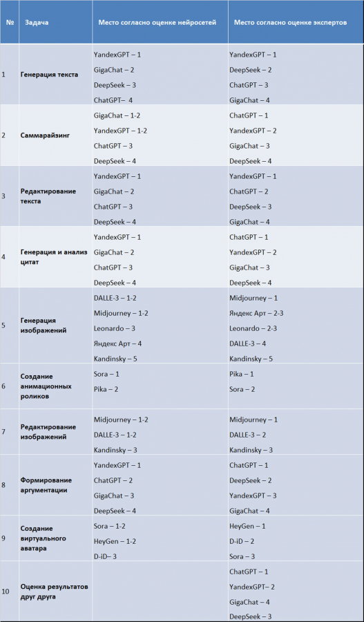 В ходе тестирования 16 нейросетей (GigaChat, DeepSeek, Yandex, ChatGPT, Kandinsky, «Яндекс Арт» («Шедеврум»), Midjourney, Leonardo, DALLE-3, «Николай Иронов» (Артемий Лебедев), Visper («Сбер»), D-iD, Sora, Pika, Synthesia, HeyGen) было выявлено, что многие ИИ-модели демонстрируют сопоставимые и вполне удовлетворительные результаты при решении типичных PR-задач. При этом каждый инструмент имеет свои особенности и ограничения, что делает выбор нейросети зависимым от конкретных потребностей, доступности ресурсов и требований пользователей к итоговому качеству контента.