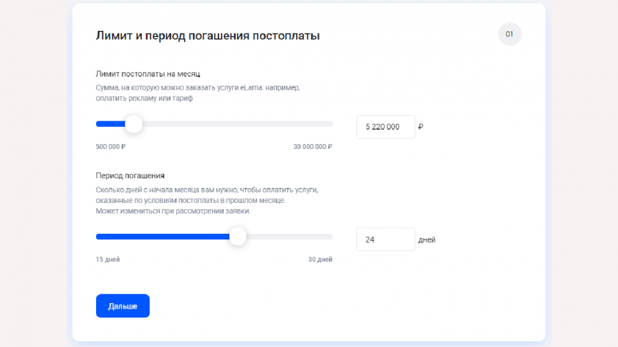 - Постоплата подключается для всего аккаунта eLama: лимит можно распределять между любыми системами, и для этого не придётся заполнять отдельные заявки .